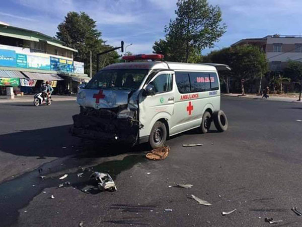 Xe cứu thương có còi ưu tiên chở bệnh nhân, khi đến ngã tư thì vượt đèn đỏ và tông vào xe bán tải khiến xe này lăn nhiều vòng và đâm vào chiếc xe khác.