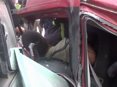 Cú đấu đầu khiến cabin xe tải găm chặt vào xe bồn, tài xế mắc kẹt liên tục la hét vì đau đớn. Hơn chục lính cứu hỏa ở Nghệ An phải dùng máy cắt thủy lực, máy banh và tời làm việc liên tục trong một giờ đồng hồ để giải cứu.