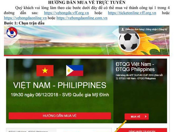 Liên đoàn bóng đá Việt Nam (VFF) chính thức bán vé xem trận bán kết lượt về AFF Cup giữa Việt Nam vs Philippines trên sân Mỹ Đình ngày 6/12 qua hệ thống trực tuyến bắt đầu từ 10h sáng nay.