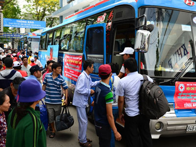 Trưa 24/1 (27 tháng Chạp), Bệnh viện Ung bướu TP.HCM chuẩn bị 6 xe khách đưa gần 200 bệnh nhân nghèo về quê ăn Tết miễn phí.