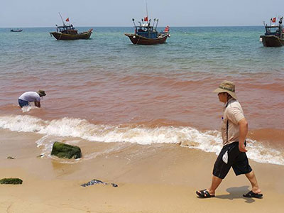 Dải nước màu đỏ hồng dài khoảng 30 m vừa mới xuất hiện tại cửa biển xã Kỳ Hà, thị xã Kỳ Anh (Hà Tĩnh) đã được nhà chức trách tỉnh này lấy mẫu phân tích, kiểm tra.