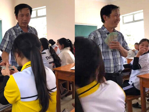Hình ảnh một thầy giáo tay cầm xấp tiền phát cho mỗi học sinh 1 triệu đồng được lan truyền trên mạng xã hội khiến nhiều người quan tâm. Hiệu trưởng trường học đã thông tin với VietNamNet thực hư về thông tin này.