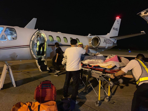 Lo ngại nạn nhân Việt kiều bị tạt axít, cắt gân chân khi chở bạn gái đi chơi ở Quảng Ngãi không đủ sức khỏe để về thẳng Canada, chuyên cơ chở nạn nhân đã hạ cánh xuống Thái Lan để tạm điều trị trước mắt.
