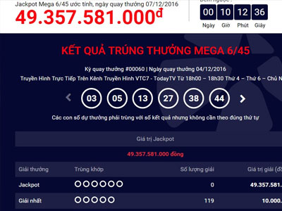 Theo công bố của Công ty xổ số điện toán Việt Nam (Vietlott), hôm nay 7/12 sẽ là kỳ quay thưởng số 60 loại hình xổ số Mega 6/45, trị giá giải Jackpot hiện đang là 49,3 tỷ đồng.
