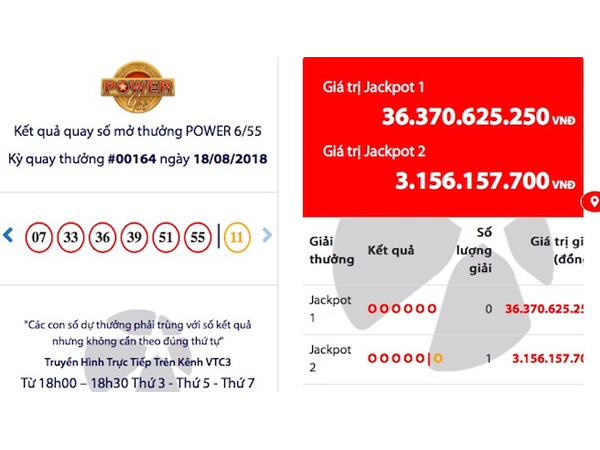 Chiều 7-8, trong kỳ quay số thứ 159 loại hình xổ số Power 6/55 của Công ty Xổ số điện toán Việt Nam (Vietlott), 1 vé đã trúng giải độc đắc 1 (Jackpot 1) trị giá 47,1 tỉ đồng
