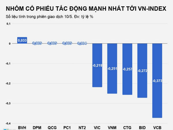 Sau phiên tăng mạnh 35,46 điểm đầu tuần, VN-Index lại bước vào chuỗi giảm điểm khi áp lực bán tăng mạnh. Kết thúc phiên hôm nay (10/5), chỉ số này mất tiếp gần 30 điểm.