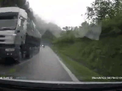 Dù đường đèo mưa to và dốc, những chiếc xe máy vẫn nối đuôi nhau vượt đầu một xe tải nên đã trượt ngã.