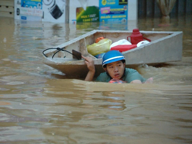 Người đàn ông đằm mình dưới nước lạnh, kéo chiếc thuyền khô đi nhận đồ cứu trợ cho cả gia đình 7 người. Hình ảnh đó đã lay động con tim của hàng triệu người chứng kiến.