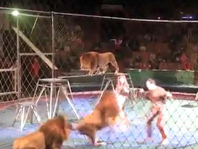 Khán giả Ukraine đã trải qua những giây phút kinh hoàng khi chứng kiến cảnh hai con sư tử đang biểu diễn trên sân khấu bất ngờ tấn công các huấn luyện viên khiến họ bị thương.