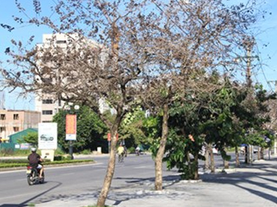 Trên một số tuyến đường Hà Nội, có nhiều cây xanh mới trồng đã chết khô, bong tróc vỏ, thậm chí phải chặt bỏ. Nhiều cây mới được trồng thay thế chưa lâu có hiện tượng khô lá, không sống được.