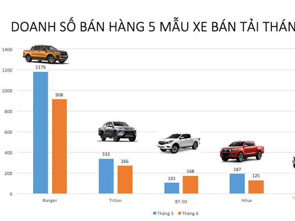 Ở phân khúc xe bán tải, doanh số tháng 5 hồi phục mạnh sau đợt nghỉ kéo dài ở tháng 4, nhưng bước sang tháng 6, các mẫu xe lại chuyển sang trạng thái sụt giảm mạnh mẽ.