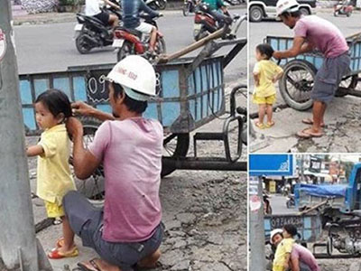 Bức ảnh người bố công nhân buộc tóc cho con gái khiến cư dân mạng “tan chảy”