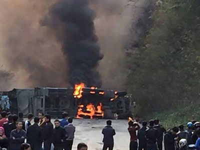 Chiếc xe bồn chở nhựa đường được cho là mất phanh đâm vào xe khách 35 chỗ chạy ngược chiều làm 3 nạn nhân thiệt mạng, hơn 20 người bị thương ở đèo Thung Khe (Mai Châu, Hoà Bình) chiều 14/3.