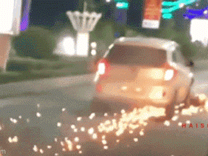 Sau khi gây tai nạn, chiếc xe ô tô vừa bỏ chạy vừa kéo lê xe máy tóe lửa trên đường.