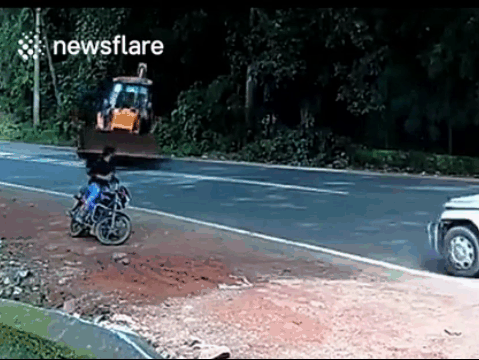 Một người đàn ông đang ngồi trên chiếc xe máy dừng bên đường đã được xe SUV cứu mạng khi suýt bị máy xúc tông trúng.