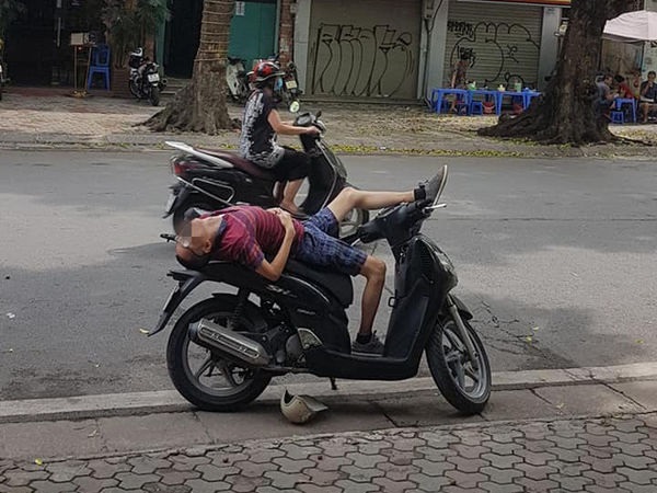 Một người đàn ông trung niên nằm trên chiếc xe SH dựng ở lề đường khiến ai đi ngang cũng phải chú ý.