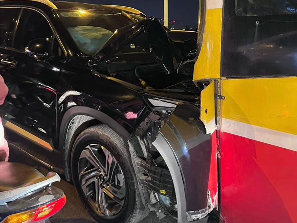 Xe SantaFe lấn làn đâm vỡ đầu xe buýt