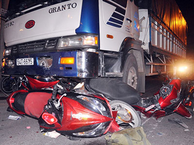Tối 21.7, một chiếc xe tải mất lái tông vào đám đông đi xe máy đang chờ đèn đỏ làm 4 chiếc xe máy bị cuốn vào gầm, hàng chục người tháo chạy.