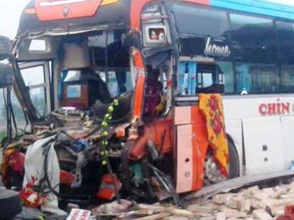Xe khách đâm xe tải lật nghiêng trên quốc lộ