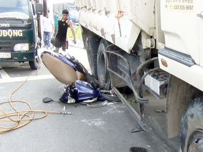 Trang 1Long An: Xe tải tông và kéo lê nhiều xe máy vào gầm, 6 người thương vong