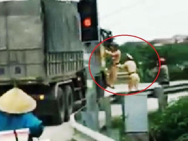 Cảnh sát phải đu lên cánh cửa xe tải biển số tỉnh Quảng Bình khi tài xế vẫn cố tình không chịu dừng theo hiệu lệnh.