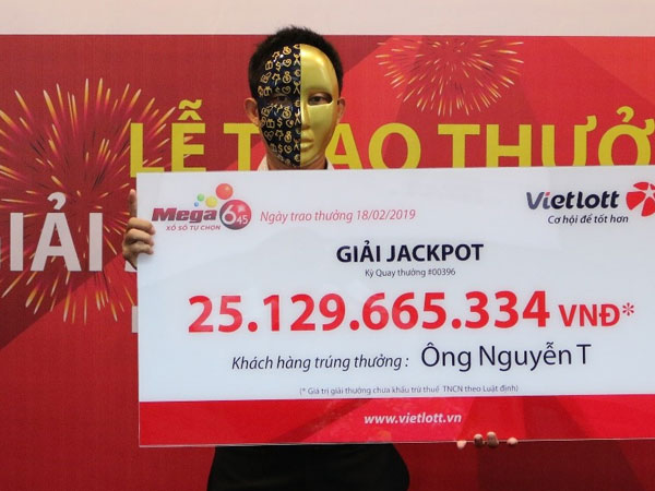 Mua một vé bao 5 loại hình Mega 6/45, chọn số theo sinh nhật các con, người đàn ông ở TP.HCM đã trúng giải cao nhất trị giá 22 tỷ đồng và vừa đeo mặt nạ nhận thưởng từ Vietlott.