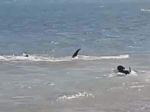 Chú chó dũng cảm lao xuống biển để truy đuổi một con cá mập hổ lớn đang bơi gần bờ.