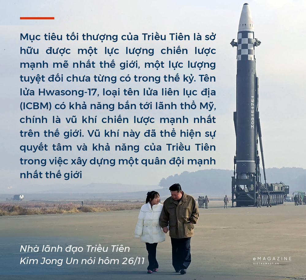 Triều Tiên năm nay liên tiếp thử tên lửa đạn đạo với tần suất cao kỷ lục, trong bối cảnh Mỹ và đồng minh nhiều lần tổ chức tập trận quy mô lớn trong khu vực. Nhà lãnh đạo Kim Jong Un tuyên bố mục tiêu cuối cùng của nước này là sở hữu lực lượng hạt nhân chưa từng có và mạnh nhất thế giới. Tuyên bố được đưa ra sau khi Bình Nhưỡng thử tên lửa đạn đạo xuyên lục địa Hwasong-17 và cam kết đáp trả các mối đe dọa hạt nhân của Mỹ bằng chính vũ khí hạt nhân.