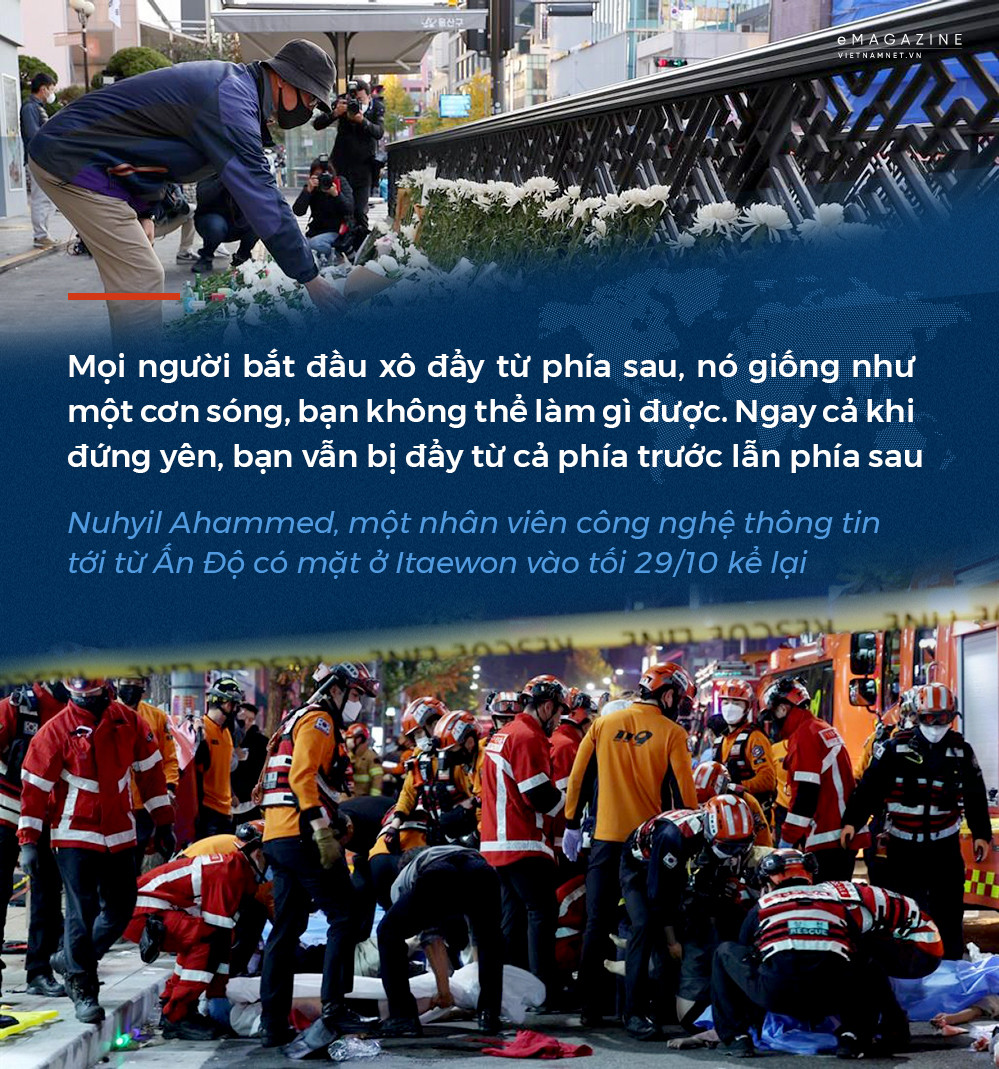 Các nhân chứng cho biết đã nhìn thấy đám đông dâng cao từ các hướng khác nhau và một số người trượt chân trên dốc, gây hiệu ứng domino. Nhiều người ngã xuống, xô ngã những người khác, khiến người này chất đống lên người khác. Nhà chức trách Hàn Quốc cho biết, có 158 người đã thiệt mạng trong thảm kịch giẫm đạp, phần lớn nạn nhân ở độ tuổi thanh thiếu niên. Tổng thống Hàn Quốc đã ban bố quốc tang sau thảm kịch và yêu cầu điều tra sự cố.