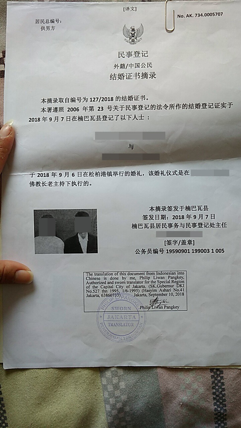 Ngày hôm sau, họ gặp nhau tại một tiệm làm đẹp, nơi cô được trang điểm. Hai người trao nhẫn, ký vào giấy đăng ký kết hôn bằng tiếng Indonesia và tiếng Trung rồi chụp ảnh. Chồng mới cưới đưa cho Monika 18 triệu rupiah, cô trả cho người môi giới một triệu và giữ số tiền còn lại. Một tuần sau, cô lên máy bay sang Trung Quốc.