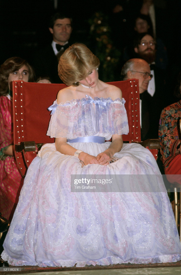 Một ngày trước khi họp báo để công bố mang thai, Công nương Diana xuất hiện trong một chiếc váy voan màu xanh nhạt tại buổi dạ tiệc ở Bảo tàng Victoria and Albert, nơi các nhiếp ảnh gia đã chụp được vẻ mệt mỏi và thiếu ngủ của cô.