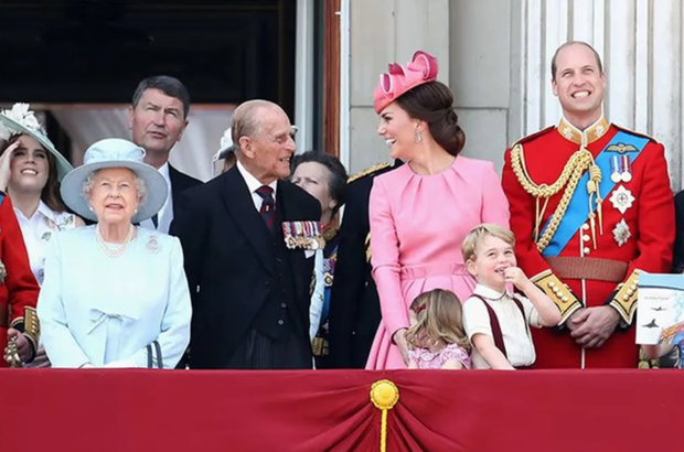 Dù bận trông chừng hai con trong lễ kỷ niệm Trooping the Colour năm 2017, nhưng Kate vẫn không quên quay sang bắt chuyện với Vương tế Philip, chồng của cố Nữ vương.
