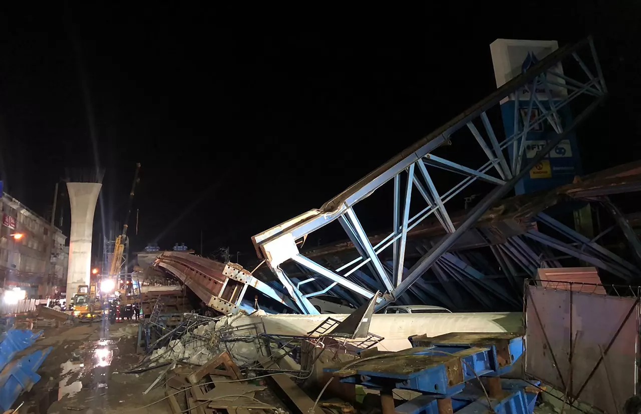 Điều tra ban đầu cho biết, một cần cẩu trong lúc nâng đoạn đường bê tông có chiều rộng bốn làn xe lên trên nhịp đã bất ngờ bị lật kéo theo cả đoạn đường đổ theo dẫn đến hàng loạt phương tiện bên dưới bị đè bẹp, một số căn nhà ven đường cũng bị hư hỏng do chịu tác động của vụ sập.