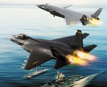 Đồ họa J-20 và J-31 tham gia tác chiến cùng tàu sân bay Liêu Ninh của Trung Quốc. |