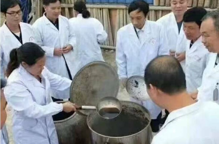 Trước đó, một bức ảnh lan truyền trên mạng xã hội ở Trung Quốc cho thấy nhiều thầy thuốc mặc áo blu trắng đứng xung quanh hai chiếc thùng lớn, và một người phụ nữ đang dùng gàu múc nước từ thùng lớn ra. Tấm biểu ngữ phía sau ghi dòng chữ: "Các bác sĩ tại huyện Tân Dương, tỉnh Quảng Tây giới thiệu thức uống trường sinh. Việc con người sống đến 120 tuổi không còn là chuyện thần kỳ".
