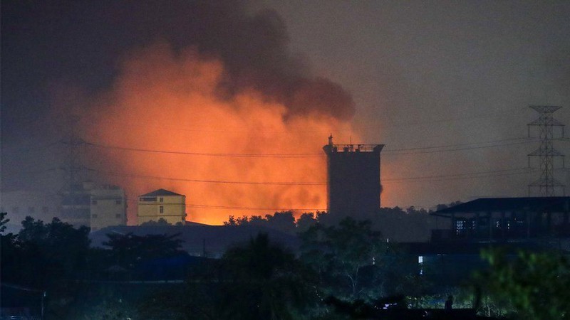 Các con đường từ Yangon tới Hlaing Thar Yar, thị trấn nơi các nhà máy bị tấn công và châm lửa đốt hôm 14/03 đã bị ngưng trệ. Khói, lửa nhỏ và các vật cản được trông thấy hôm 15/03.