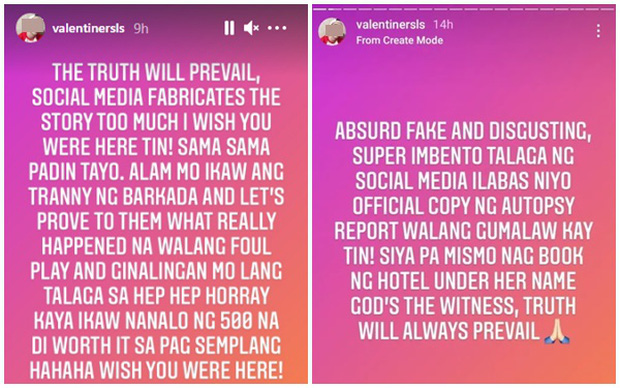 Trong lúc sự việc đang gây xôn xao, Valentine Rosales - người bị tình nghi có liên quan vụ án, nằm trong số 11 nghi phạm đã lên tiếng về cái chết của nạn nhân trên mạng xã hội.