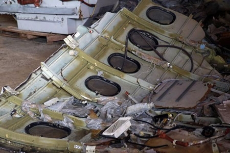 | Một mảnh thân máy bay được trục vớt lên tàu. Ảnh: Reuters |