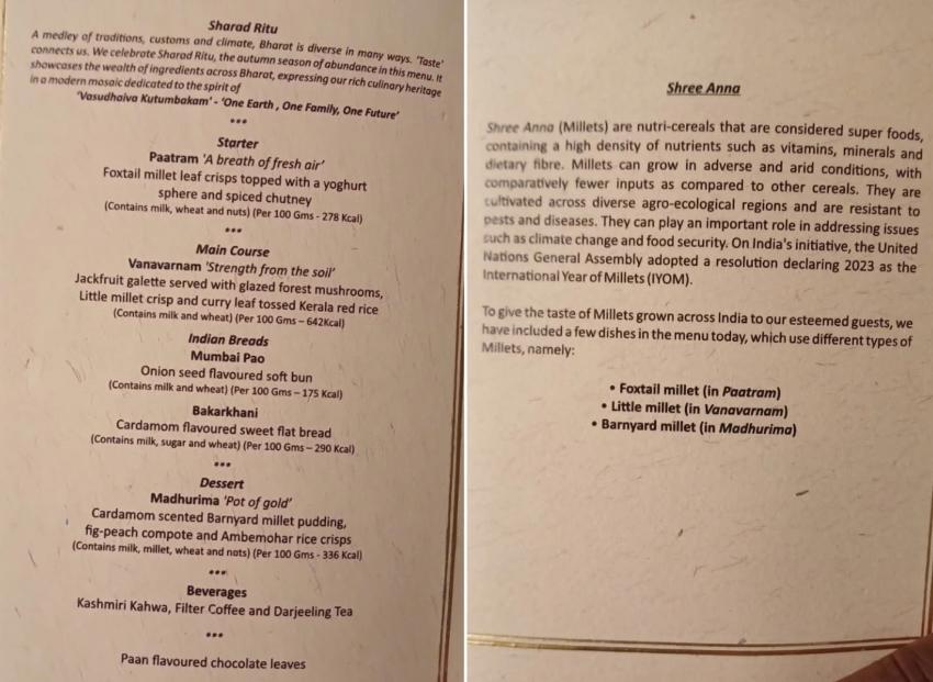 Bữa tiệc tối do Tổng thống Murmu chủ trì bao gồm ba món ăn chay, được chế biến từ các loại kê khác nhau. Món chính là bánh mít ăn kèm với nấm rừng, bánh kê chiên giòn và lá cà ri trộn với cơm gạo đỏ Kerala. Hai loại bánh mỳ của Ấn Độ là Bakarkhani - loại bánh mỳ dẹt, dày và ngọt cùng bánh Pao mềm nổi tiếng của Mumbai cũng nằm trong thực đơn. Các loại nước uống như Kashmiri kahwa từ khu vực phía bắc, cà phê phin nổi tiếng ở miền nam và trà Darjeeling cũng được Ấn Độ mời khách.Ca