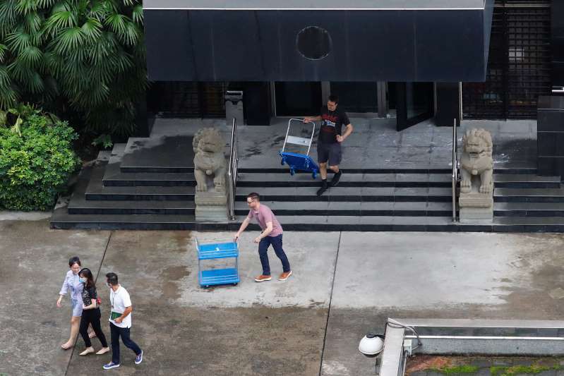 Phù hiệu lãnh sự bên trong khu ngoại giao này đã được dỡ xuống trong khi các nhân viên được trông thấy đang đẩy nhiều xe đẩy cùng với một số chiếc xe đến và rời đi.
