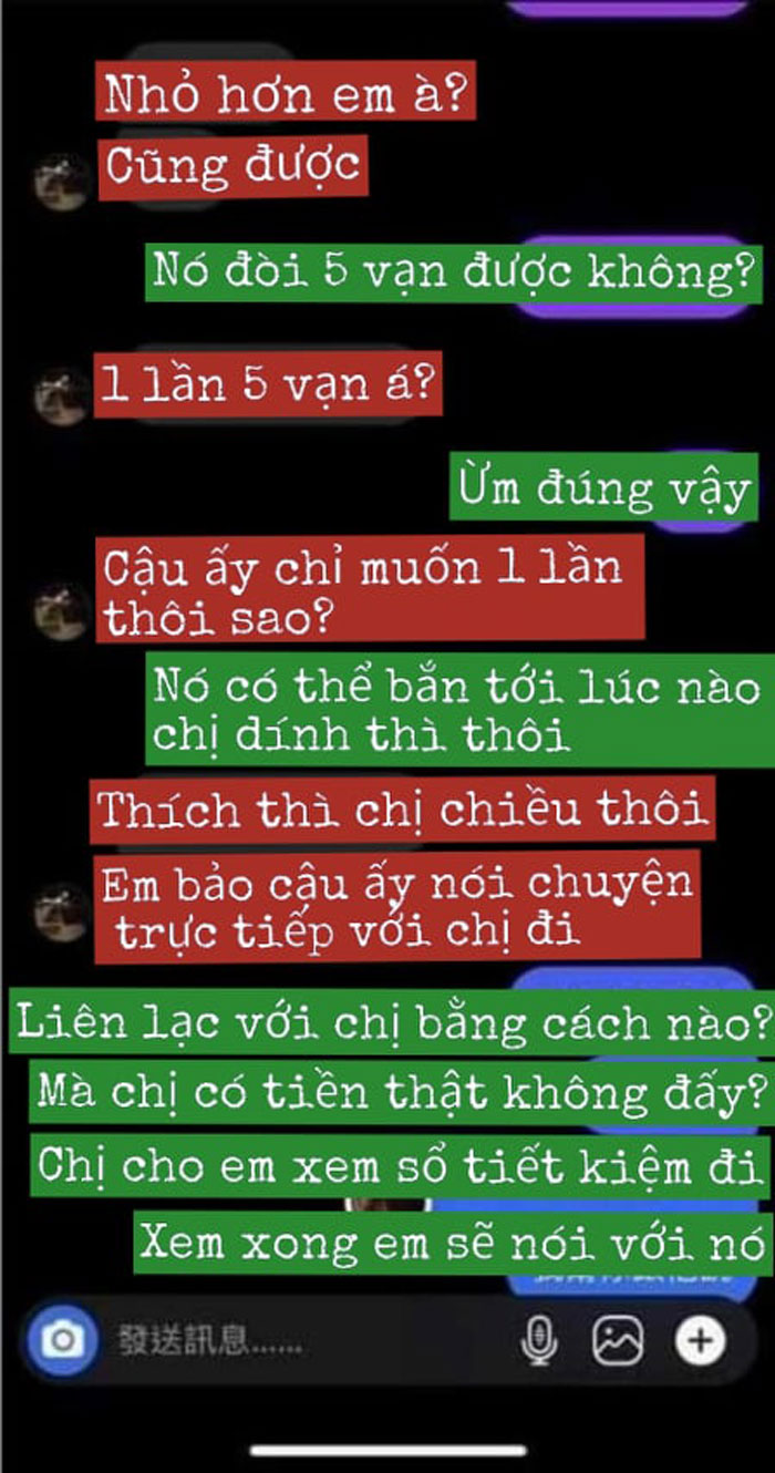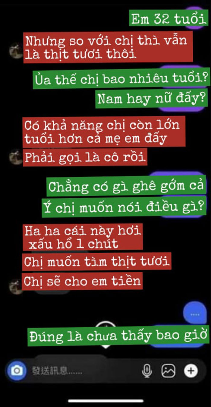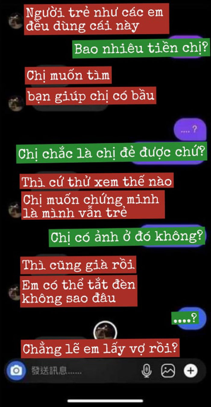 Cụ thể theo thông tin từ PO - người đưa ra đoạn tin nhắn cho biết, người phụ nữ này thường đăng ký các tài khoản ảo trên nhiều trang mạng xã hội khác nhau để tìm đối tượng. Cô chủ động kết bạn với tiểu thịt tươi và luôn thẳng thắn ý tưởng của mình ngay từ đầu rằng muốn tìm trai trẻ để giúp mình sinh con, đổi lại đối phương sẽ nhận được một khoản tiền hậu hĩnh. Tuy nhiên, khi nghe được số tuổi thực của "kim chủ", đối phương đã phải thốt lên nghi ngờ: "Chị chắc là mình còn sinh được chứ?"