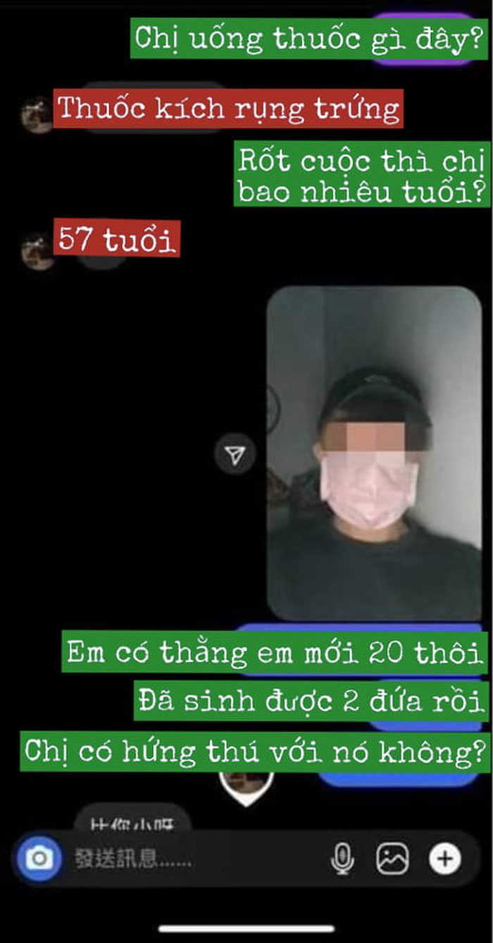 Một người phụ nữ 57 tuổi người Trung Quốc đã inbox riêng cho một tiểu thịt tươi (chỉ những chàng trai trẻ có ngoại hình xuất chúng và được nhiều người biết đến) để hỏi cậu ấy: "Em có muốn làm chị mang thai không?". Để chứng minh bản thân vẫn còn trẻ, người phụ nữ này đã uống cả thuốc kích thích rụng trứng và tìm đến tiểu thịt tươi xin giúp đỡ.