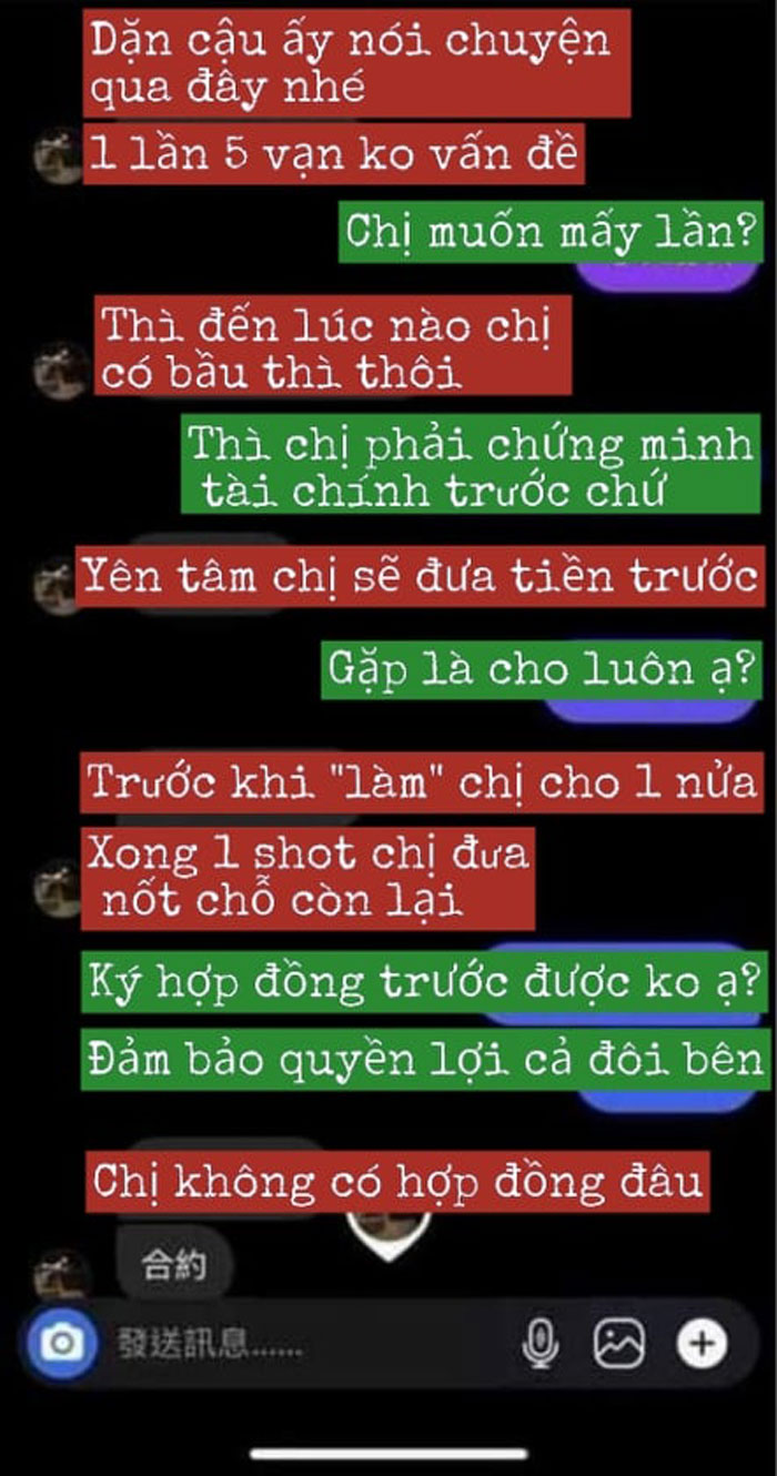 Thấy tiểu thịt tươi này có ngoại hình sáng láng, cô lập tức "động lòng" và yêu cầu được nói chuyện trực tiếp. Thậm chí hào phóng cho anh ta ứng trước 50% khi gặp mặt. Số tiền còn lại sẽ được thanh toán khi cô chắc rằng mình mang thai.