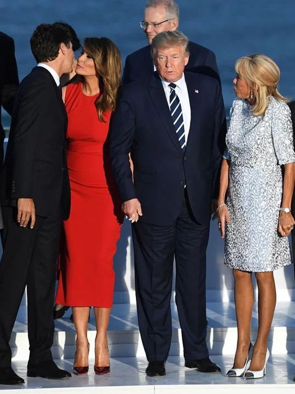 Đây là khoảnh khắc các nhà lãnh đạo khối G7 cùng phu nhân của họ tập trung lại để chụp ảnh kỷ niệm, ông Trump đang đứng cùng bà Melania thì Thủ tướng Canada Justin Trudeau xuất hiện trong bộ vest đen lịch lãm. Đệ nhất phu nhân Mỹ đã nghiêng người hôn lên má để chào đón ông Trudeau trong khi ông Trump đứng nắm tay ở bên cạnh.