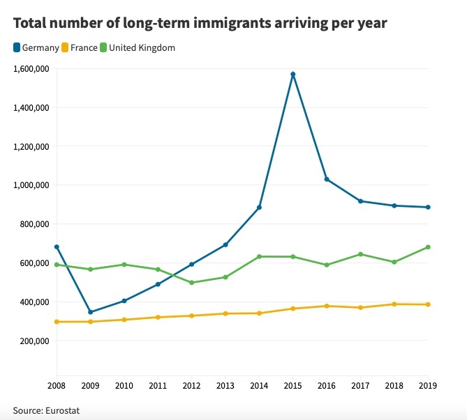 Khi đó, bà Merkel đã đưa ra những quyết định táo bạo. Bà quyết định mở cửa biên giới Đức và cho phép hơn 1 triệu người tị nạn và di cư vào Đức năm 2015. Động thái này được phản ánh trong biểu đồ dưới đây. Dữ liệu nhập cư của Eurostat bắt đầu được xây dựng vào năm 2008.