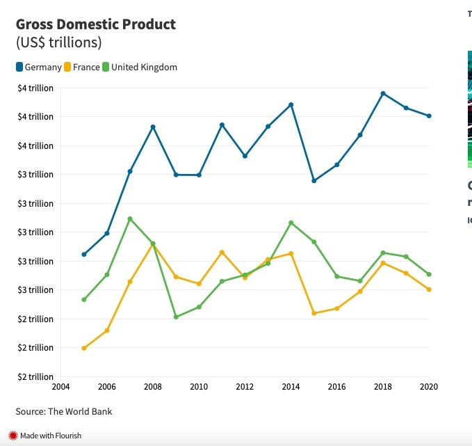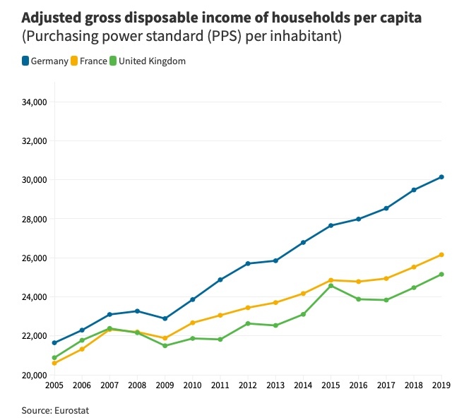 Ở Đức, tổng thu nhập khả dụng của hộ gia đình trên đầu người là 30.142 Euro vào năm 2019. Trong khi đó, ở Anh là 25.155 Euro và ở Pháp là 26.158 Euro, theo dữ liệu của Eurostat.