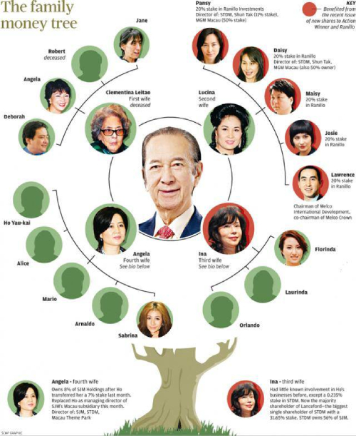 Hà Siêu Hiền (trái), Hà Siêu Hùng (phải), hai người con cả của ông Hà Hồng Sân liên tục đâm đơn ra tòa để "dằn mặt" các đối thủ. Hà Siêu Hiền (Angela Ho) là con cả của ông Hà Hồng Sân với bà vợ đầu. Theo hồ sơ đăng ký đất đai tại Hong Kong, dinh thự của ông Hà Hồng Sân ở số 1 đường Repulse Bay đã được chuyển nhượng cho Hà Siêu Hiền từ năm 2011. Cô cũng chính là người được bố ủy thác quỹ The Clementina Ho Trust and The Stanley và Clementina Family Trust. Ngoài ra, cô và em gái Hà Siêu Hùng không nằm trong danh sách có cổ phần tại "cỗ máy kiếm tiền" là các sòng bạc Macau.