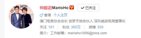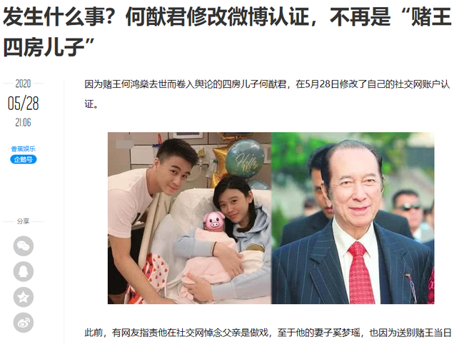 Mới đây, Hà Du Quân - chồng Hề Mộng Dao lại có động thái bất ngờ khi sửa thông tin trên trang cá nhân Weibo. Thay vì "profile" con trai của "vua sòng bài Macau" Hà Hồng Sân như trước đây, Hà Du Quân đã đổi thành danh xưng Chủ tịch Hiệp hội Thể thao Điện tử Macau.