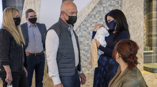 Xuất hiện tại sự kiện, bạn gái tỷ phú Jeff Bezos ăn vận thanh lịch và kín đáo trong trang phục tối màu, đeo khẩu trang đồng màu. Tỷ phú Amazon cũng ăn vận giản dị và đeo khẩu trang màu đen. Đây là dịp hiếm hoi công chúng nhìn thấy bà Lauren tham gia công việc chung với tỷ phú Amazon sau khi cả hai chính thức hẹn hò cách đây 2 năm.