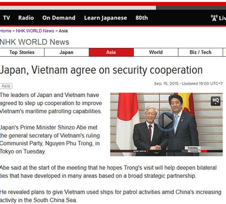 Đài truyền hình NHK chạy bài mang tựa đề Japan, Vietnam agree on security cooperation (tạm dịch: Nhật Bản, Việt Nam nhất trí hợp tác an ninh) với một số nội dung chính sau: Phát biểu trong cuộc họp báo trước thềm cuộc họp, Thủ tướng Abe bày tỏ hi vọng rằng, chuyến thăm của Tổng Bí thư Ban Chấp hành Đảng Cộng sản Việt Nam Nguyễn Phú Trọng sẽ giúp làm sâu sắc mối quan hệ song phương giữa hai nước phát triển ở nhiều lĩnh vực. Cùng với đó, cả hai lãnh đạo cùng nhất trí tăng cường hợp tác để duy trì trật tự hàng hải và hàng không trên Biển Đông.
